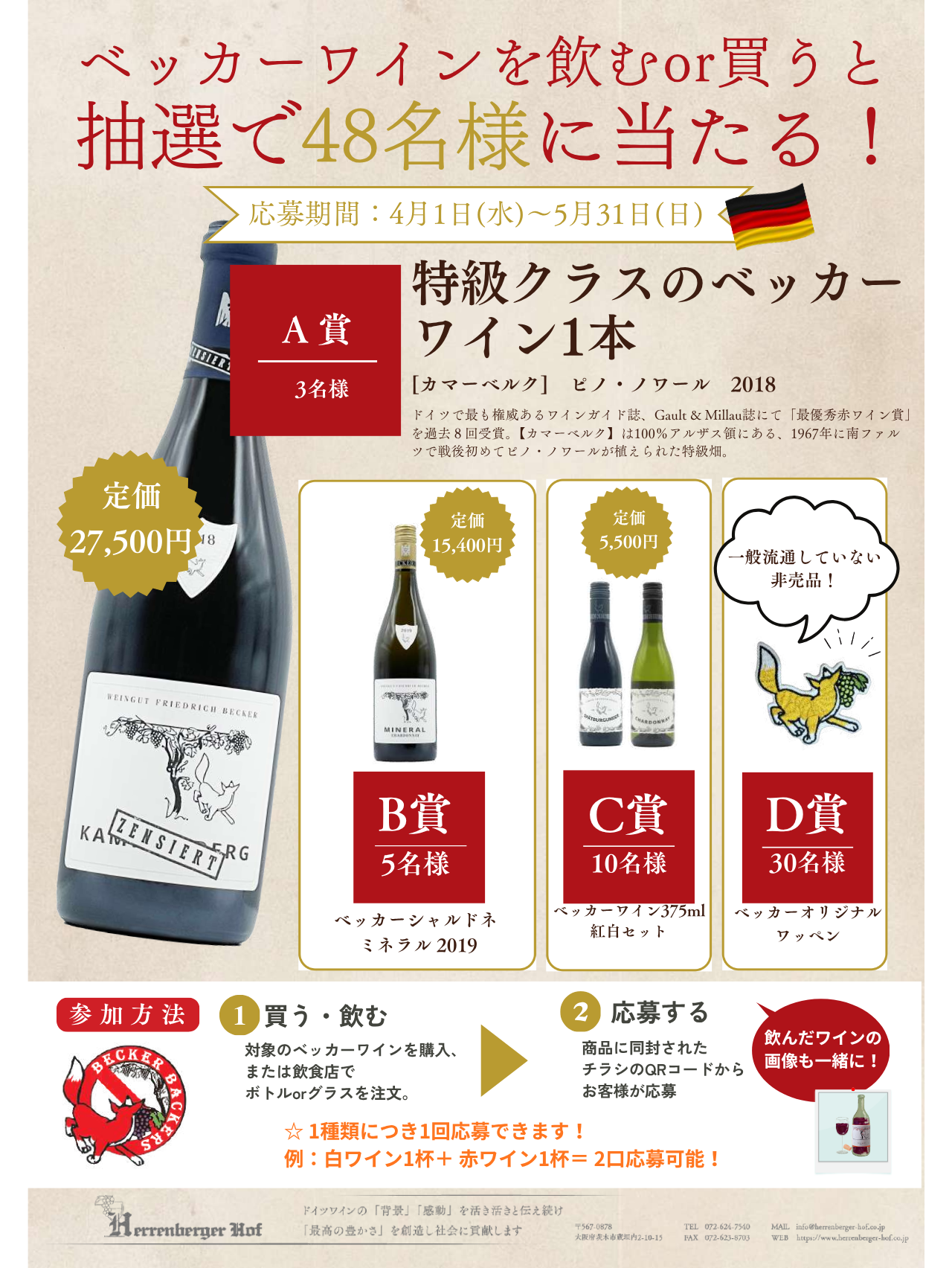 飲食店様で ベッカーのワインをグラスやボトルで楽しまれたお客様がご応募できる