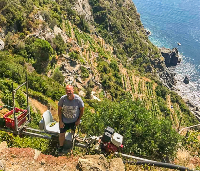 リグーリア州の東南部に位置するリオマッジョーレは、世界遺産チンクエテッレの一つで、5つの街からなるチンクエテッレの中では東南端にあり、フィレンツェから北西に160kmほどとトスカーナやエミリア ロマーニャからも近いためリゾート地として賑わってきた地域です。父親がチンクエテッレ国立公園の会長を勤めているサムエーレ ハイディは、この地域の現状に危機感を覚え、人とこの土地との共生の証であるブドウ畑の景観、そしてチンクエテッレの伝統を守るべく2004年に自らワイナリーを始めました。5つの町を囲むように広がる、総延長6700Kmにも達する石垣の段々畑は、平地がほとんどなく痩せた土壌であるチンクエテッレで暮らしていくために、急斜面の岩盤を砕いた際に出る砂を畑に、出た石を石垣にしてきた住民の命懸けの歴史を物語っています。